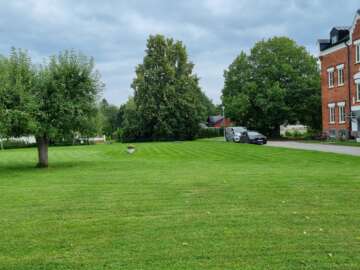 Framför huset breder en stor, välskött gräsyta ut sig, omgiven av träd och grönska som skapar en lugn och trivsam atmosfär.