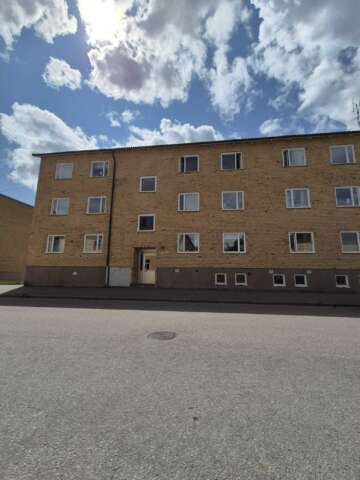 Denna fastighet har en gul tegel fasad, 3 våningar och en källare.